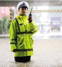 东西湖区交通大队一名交警在渍水路段做“人体路标”,为过往车辆司机提供导航。