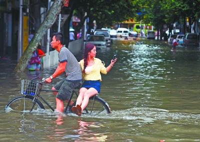 昨天下午,在汉口解放大道单洞门路段,一名男子骑自行车带着女友经过渍水区。武汉晚报记者金思柳摄