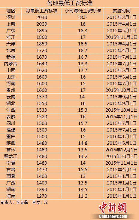 调整之后,深圳、上海两地月最低工资标准分别为2030元、2020元,最低工资标准超过2000元大关。而小时最低工资标准最高的依然是北京,达到18.7元。