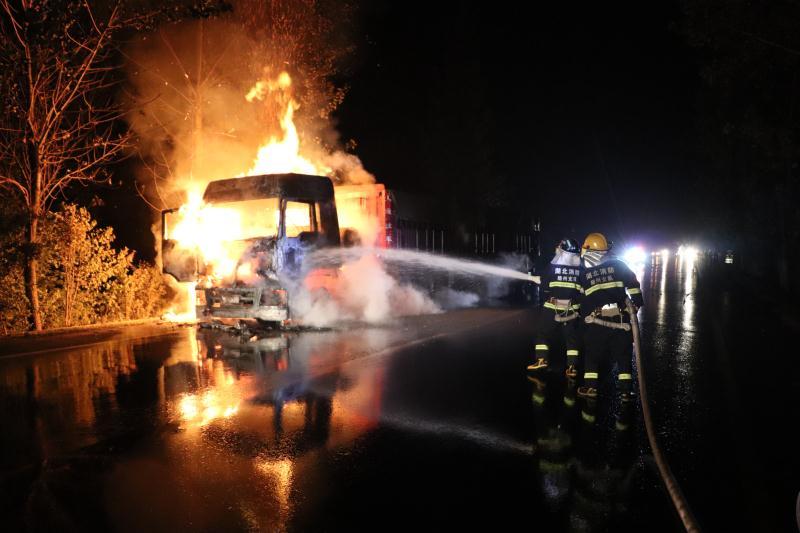 【本网讯】记者惟我独俊 通讯员曾强奔报道: 9月24日4时20分,随县中队接到支队指挥中心调度称:位于湖北省随州市唐县沙子加油站旁一辆满载煤炭的半挂车起火。接到报警后中队立即出动2车9人到场处置。