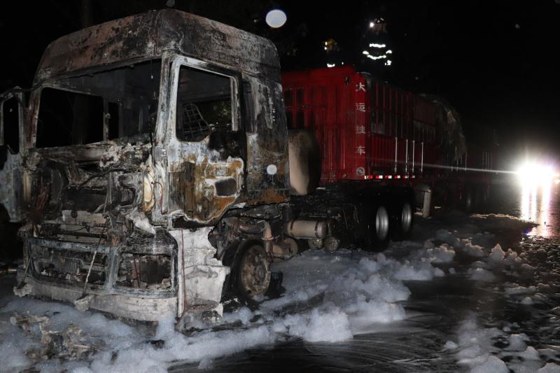 满载33吨煤700斤天然气挂车凌晨在唐镇一加油站旁起火