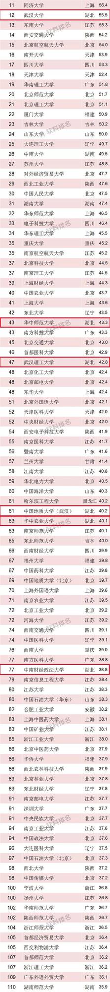 湖北共有30所高校上榜,更骄傲的是湖北7所上榜全国百强数量居全国第4