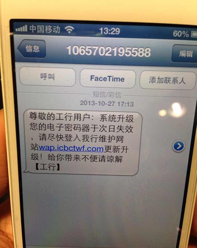 12月24日,小王的手机突然响了,拿起来一看,是一条由“95588”发来的短信。短信内容很简单,上面说:“尊敬的用户:您的电子密码器将于次日失效,请立即登录我行网站进行升级,给您带来不便敬请谅解。