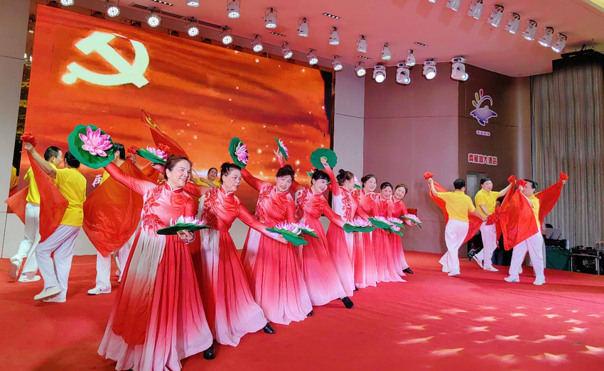 压轴登场的是飞来土社区的舞蹈《南湖的船,党的摇篮》。舞者以柔美而有力的舞姿,再现红船破浪启航的历史瞬间,红裙似火,象征着党与人民心手相连的深厚情谊,也为整场汇演画上圆满句点。