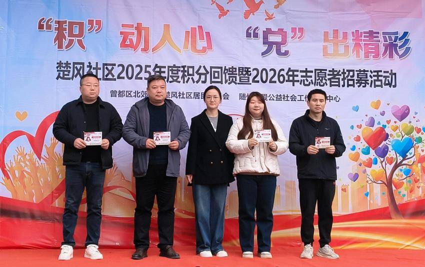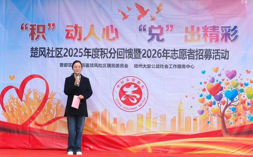 3月20日上午,北郊街道楚风社区开展“‘积’动人心,‘兑’出精彩”2025 年度志愿服务积分回馈暨 2026 年志愿者招募活动,通过表彰激励、积分兑换、公益集市相结合的形式,弘扬志愿精神,提升社区治理效能。