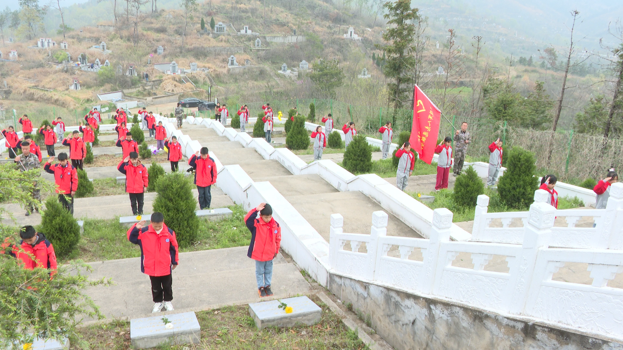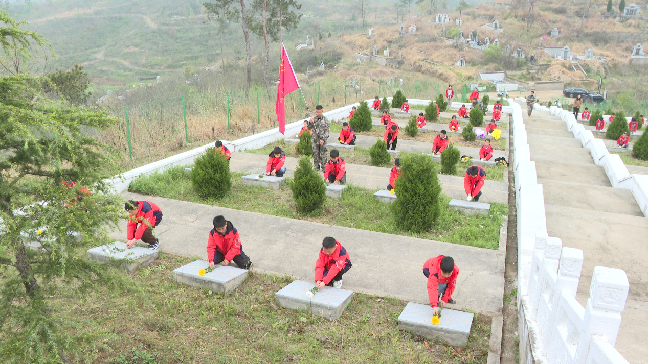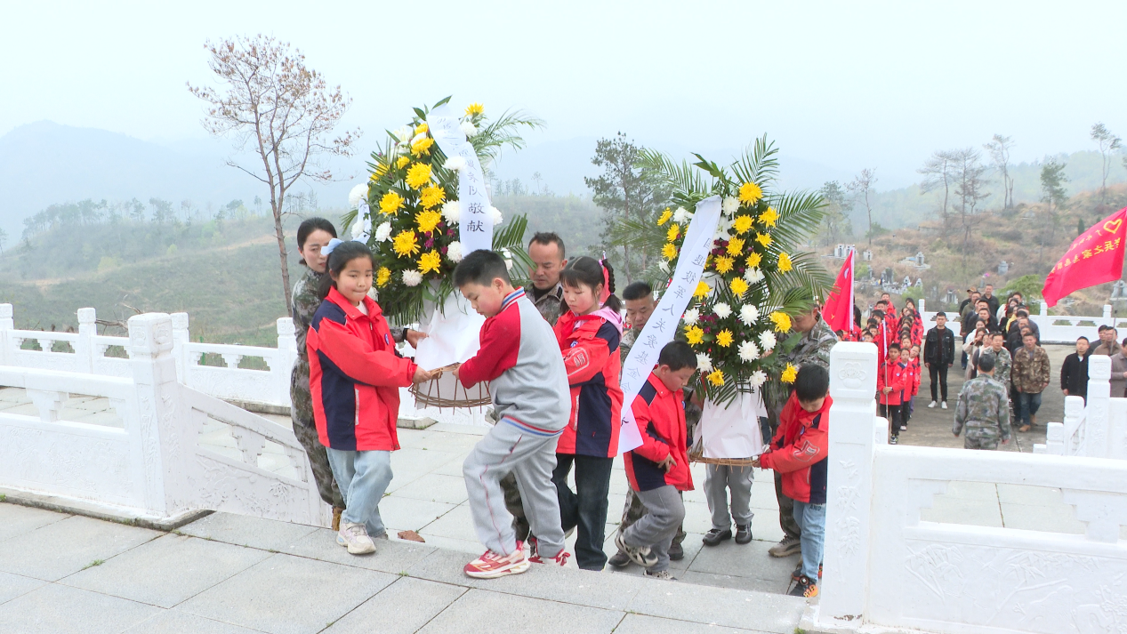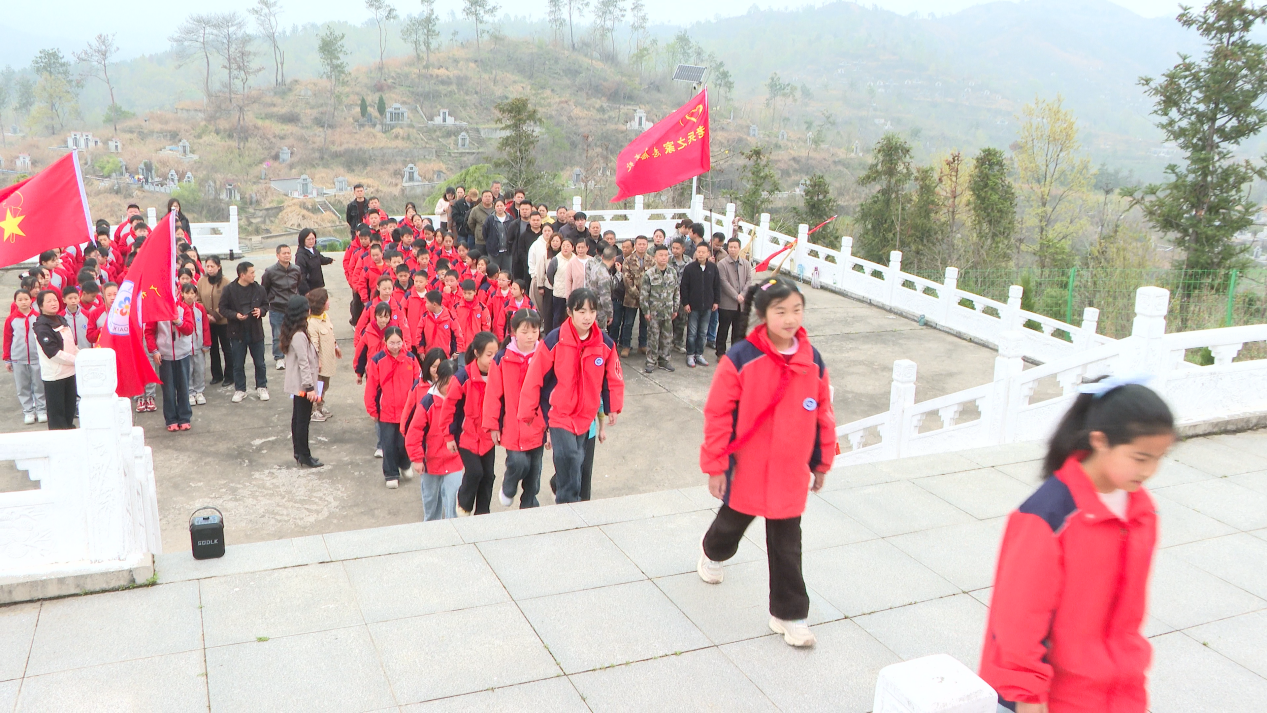 宣誓完毕,全体人员依次瞻仰烈士纪念碑,少先队员手持黄白菊花,缓步走向烈士墓碑,郑重敬献鲜花、深情缅怀。