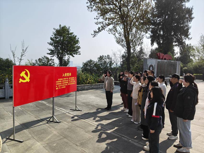 在社区党委书记的带领下,全体党员面向鲜红的党旗,举起右拳,庄严重温入党誓词。“我志愿加入中国共产党,拥护党的纲领,遵守党的章程……”铿锵有力的誓言在陵园上空回荡,字字句句彰显着党员们不忘初心、牢记使命,为党和人民事业奋斗终身的坚定信念,也让在场每一位党员接受了一次深刻的党性教育和精神洗礼。